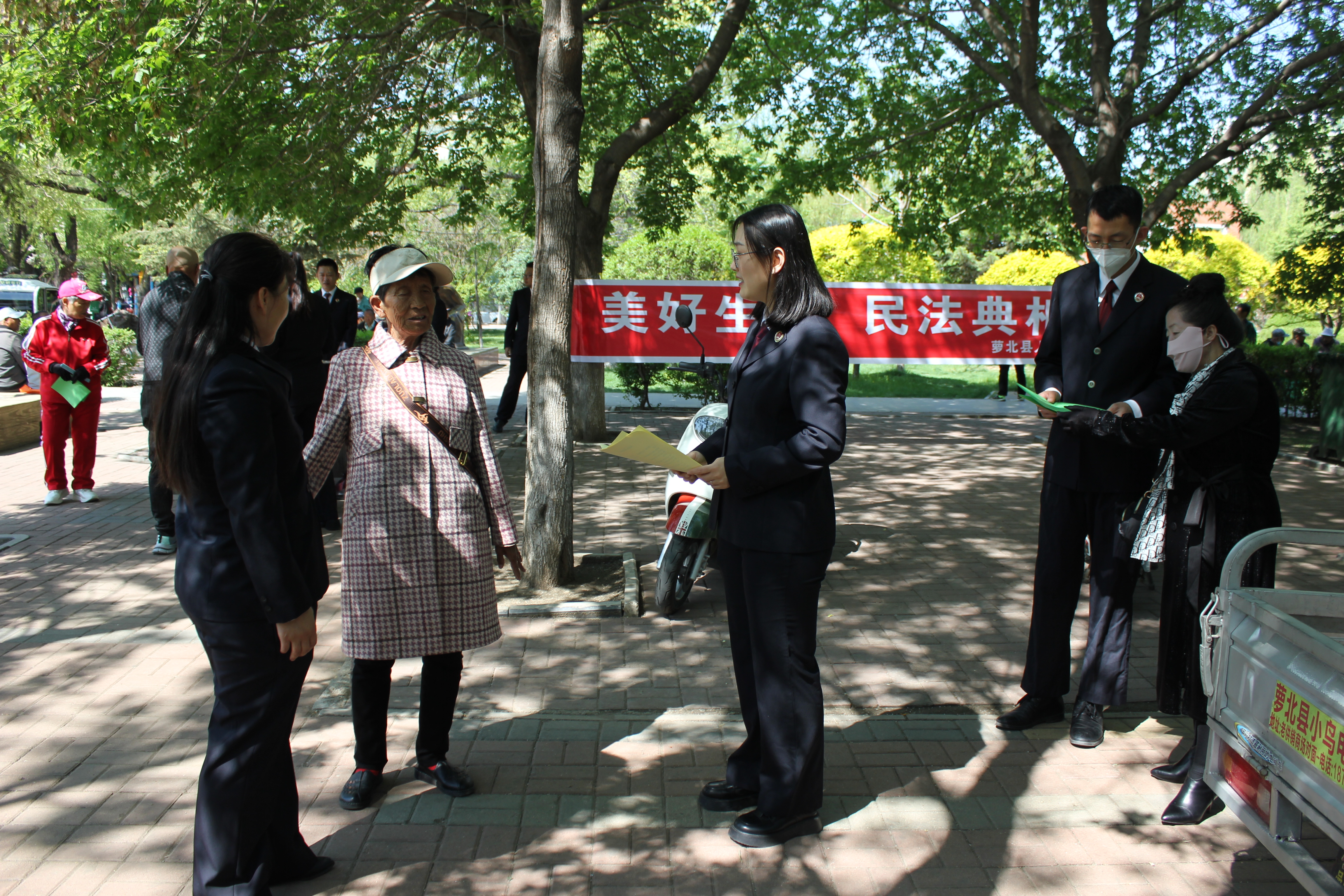 五月清风絮语散芳香,公园景色宜人美如画,我院干警走进萝北县凤祥镇中心公园,通过悬挂横幅、发放宣传手册、面对面讲解等方式,以《民法典》侵权责任编内容为切入点,围绕立法目的,对法条变化及重点条文进行了细致的讲解。普法宣传中,检察干警“订单式”服务,对百姓关心的婚姻问题结合《民法典》婚姻家庭编部分进行了解答。